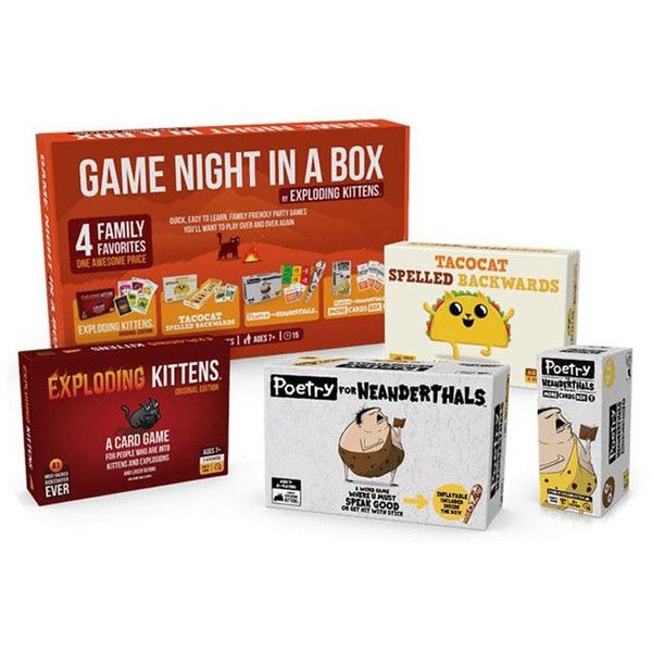 This bundle is game night in a box. Especially curated by Exploding Kittens, this box includes everything you need to host game night except the seven-layer dip. Includes Exploding Kittens: Original Edition, Tacocat Spelled Backwards, Poetry for Neanderthals, and Poetry for Neanderthals Expansion! Quick, simple-to-learn, family-friendly party games.
